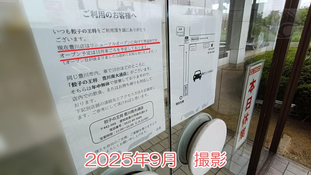 【リニューオープン】お待たせしました!「餃子の王将 豊川店」は2025年10月末頃にリニューアルオープン予定だよー!