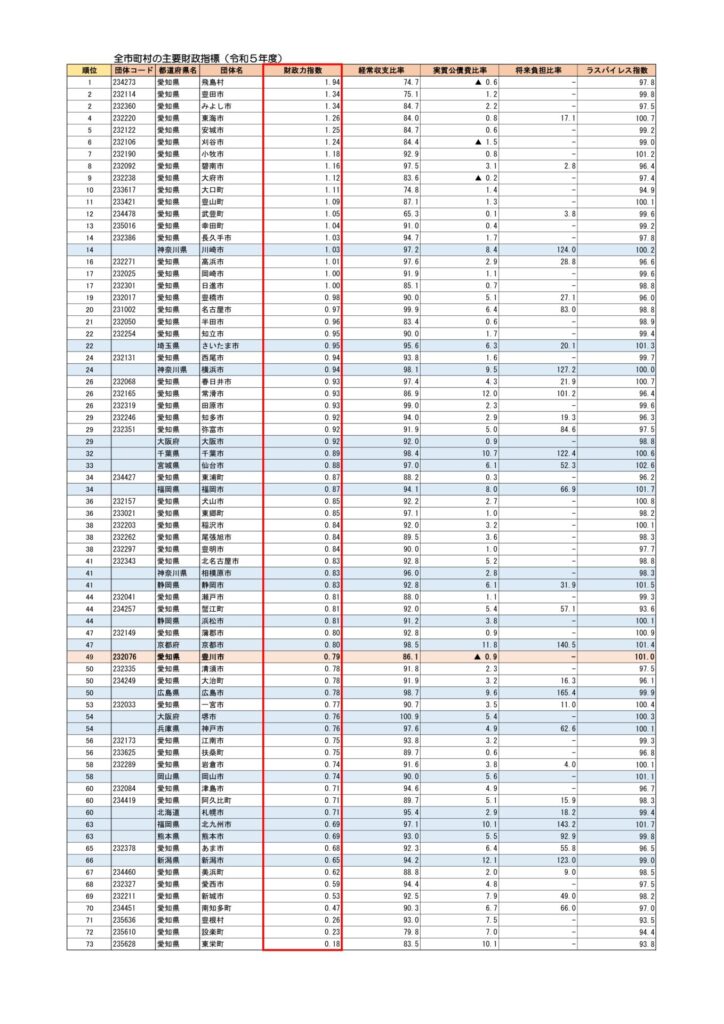ちなみに愛知県1位の飛島村(1.94)は全国でもぶっちぎりの1位です。