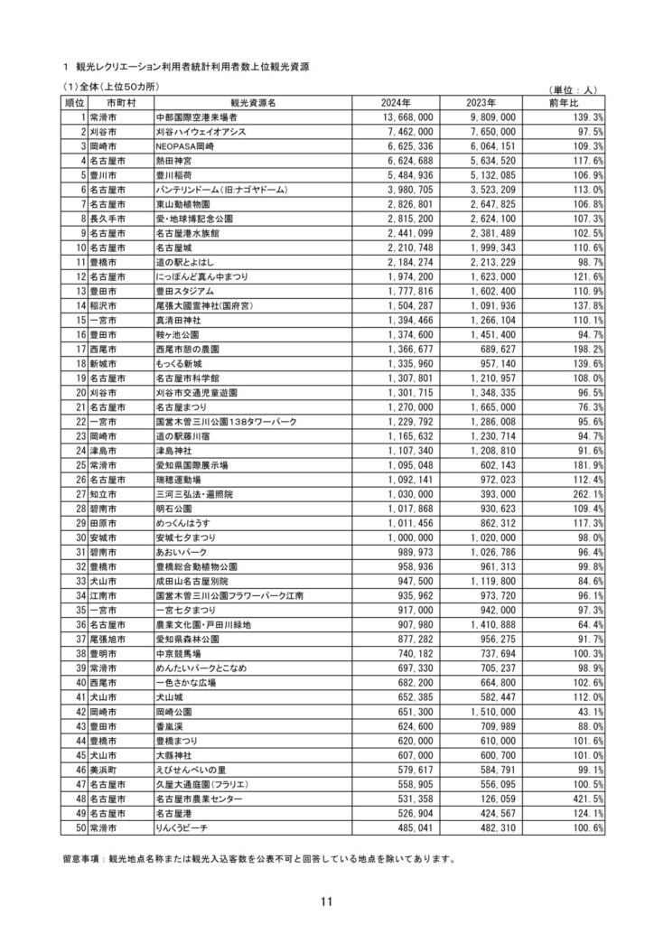 2024年のデータですが、”愛知県内の観光レクリエーション資源・施設における利用者数”はなんと第5位です。
