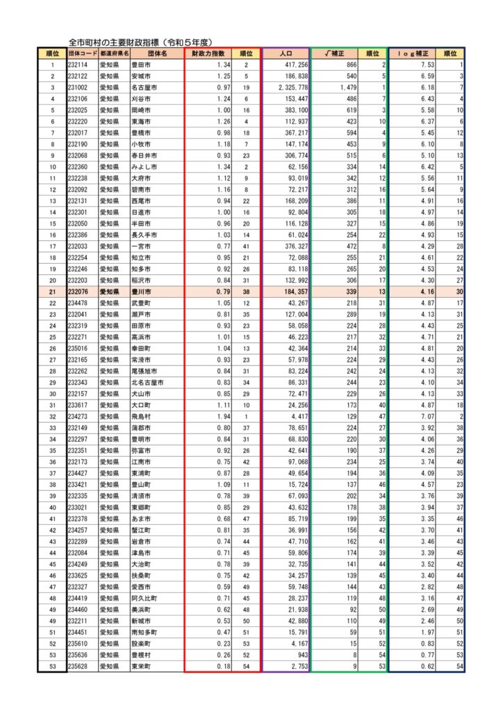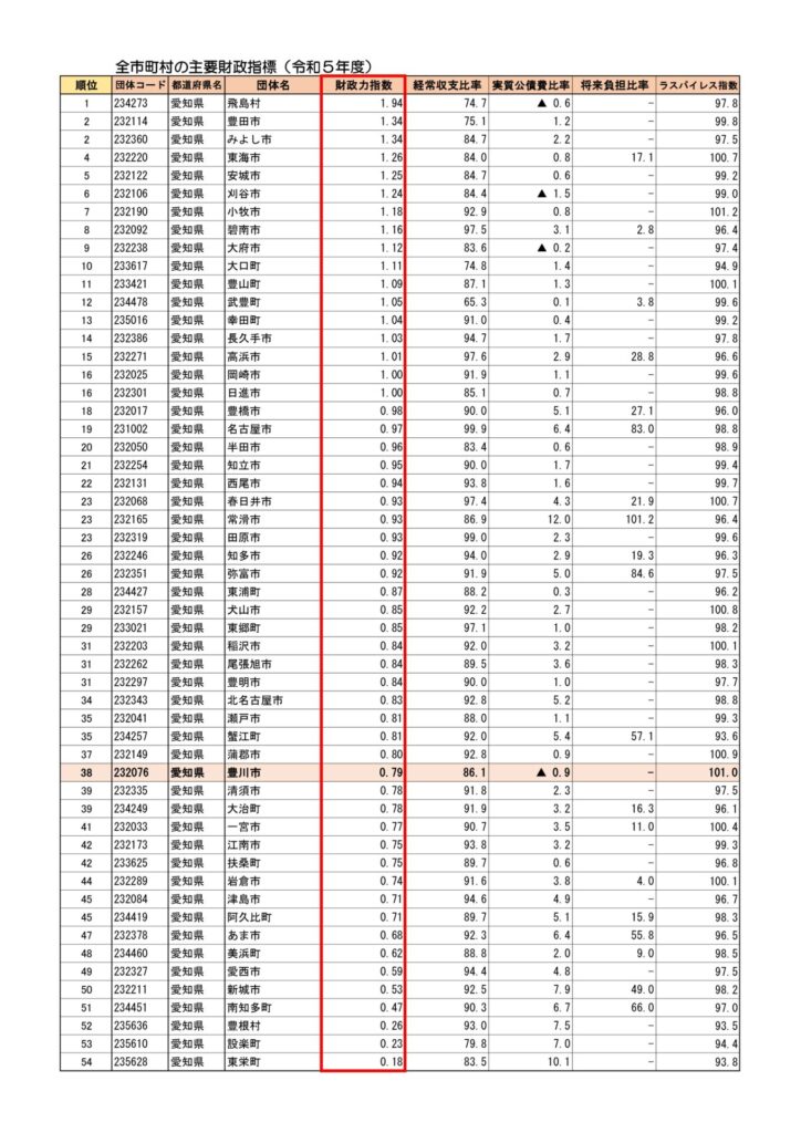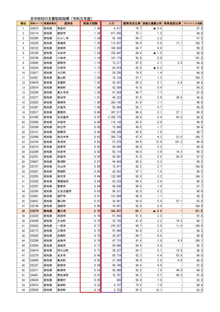 単純な財政力指数の順位は、愛知県内54の市町村のうち、豊川市は38位。これは下位30%くらいの位置です。