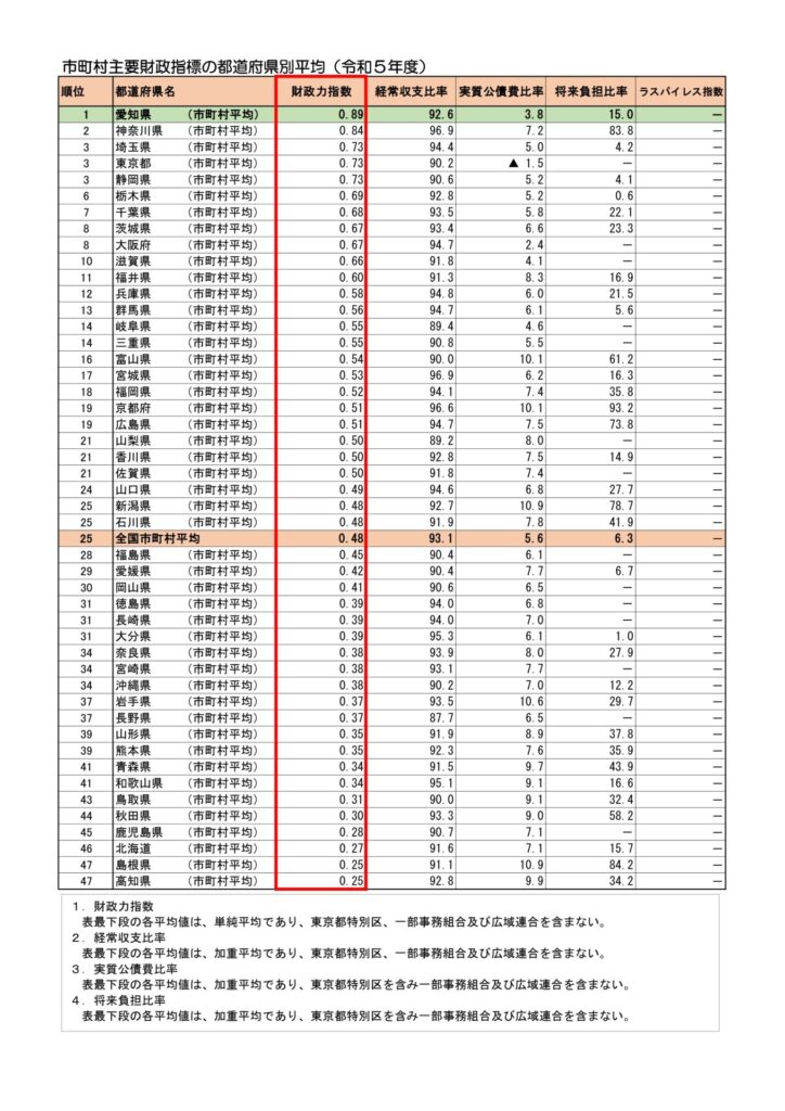 以下の財政力指数は、総務省が発表している”令和5年度地方公共団体の主要財政指標一覧”を参考にしています。