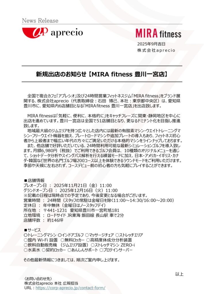 株式会社aprecioのプレスリリースに”新規出店のお知らせ 【MIRA fitness 豊川一宮店】”とありました。