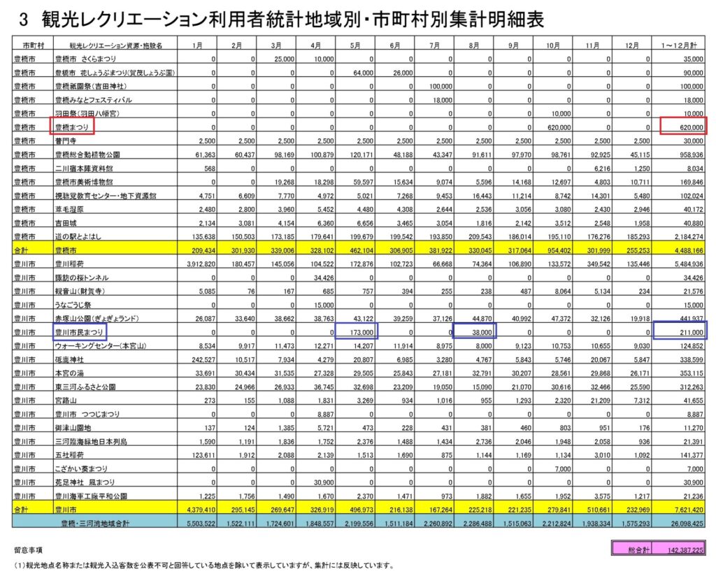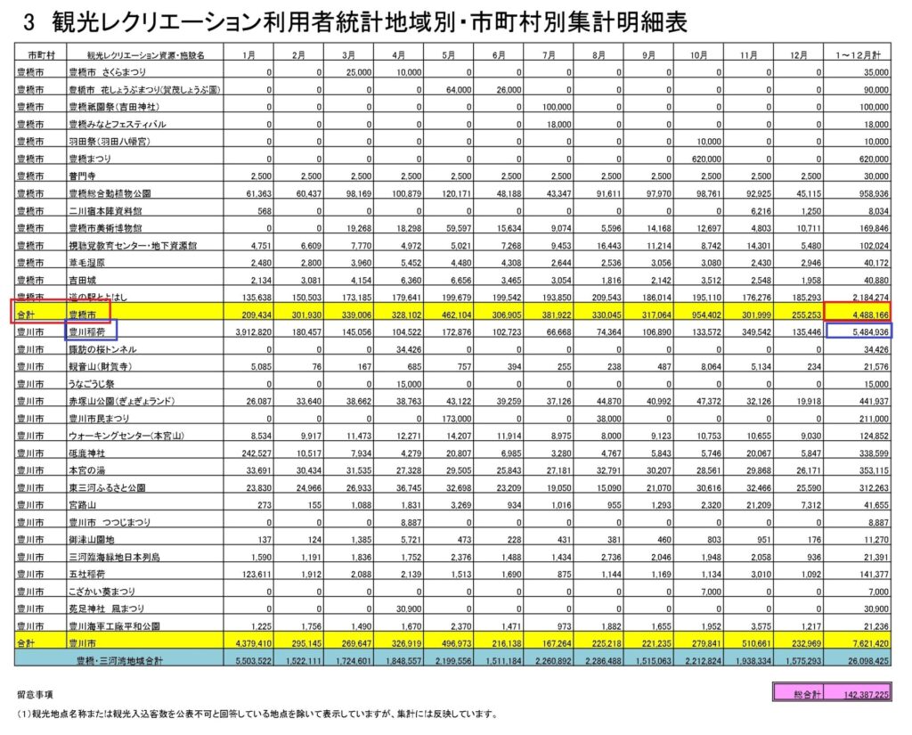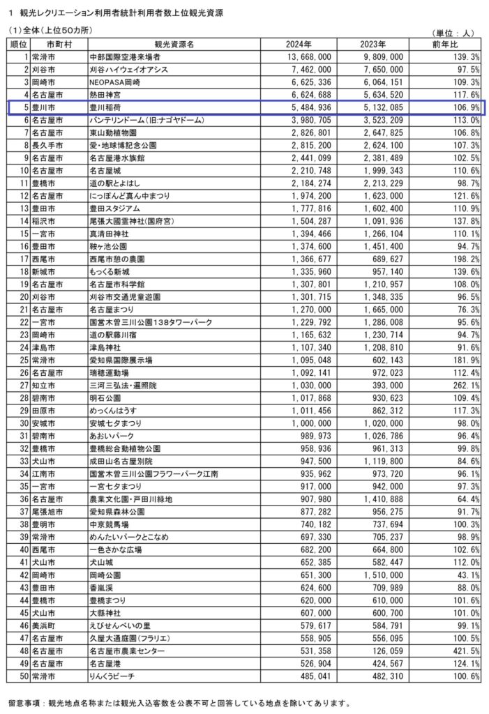 ぜひ参照元のデータをご確認頂ければと思いますが、豊橋市全施設・全イベントの観光客数合計より豊川稲荷の観光客数の方が多いんですよ。