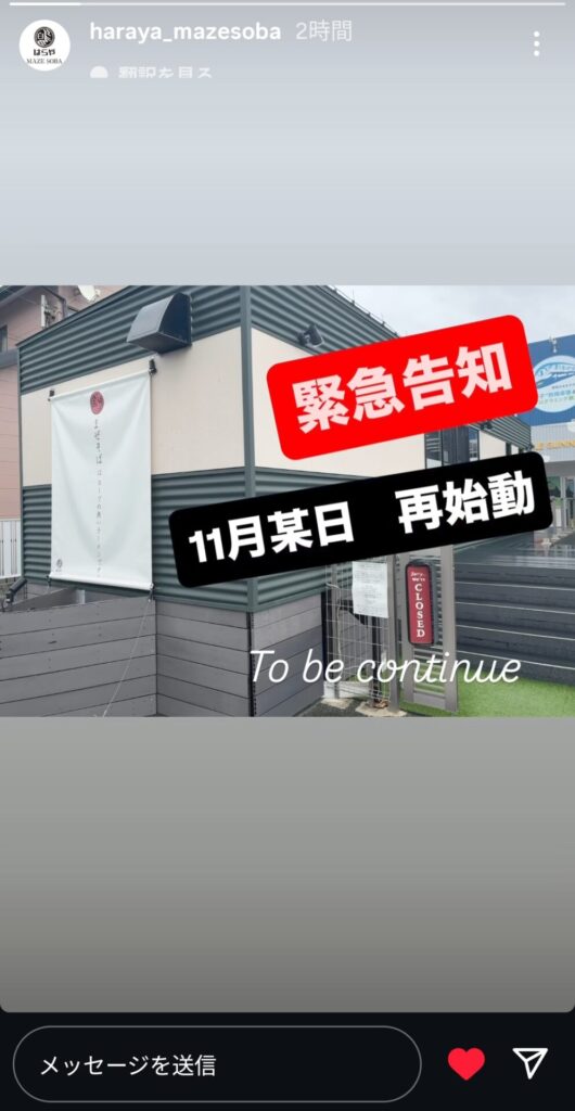 実は「はらやMAZESOBA」、2025年9月1日から”人手不足”のため臨時休業中でした。