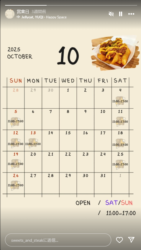 営業日などは「スイーツさんとステーキさん」のインスタグラムをチェック。