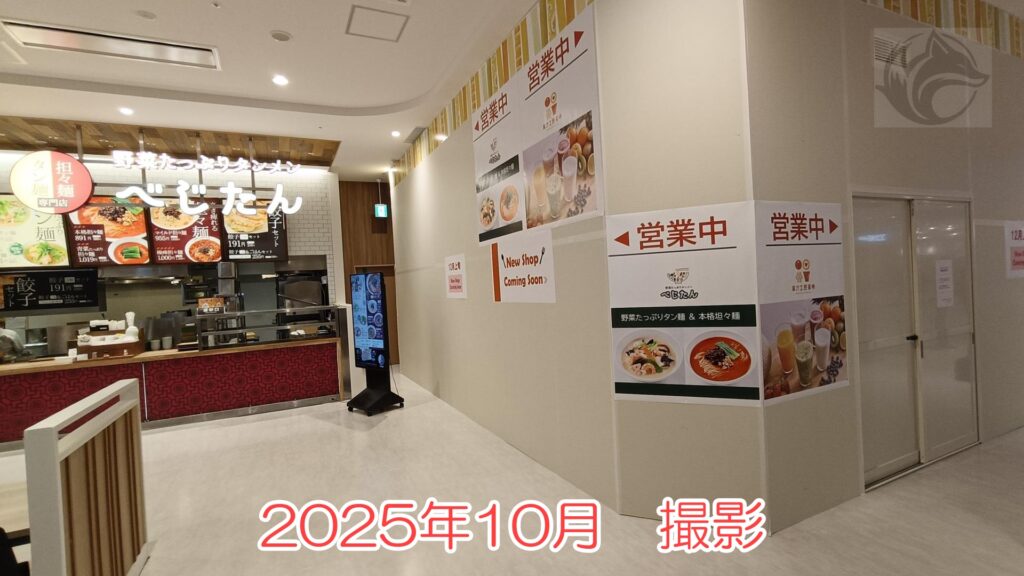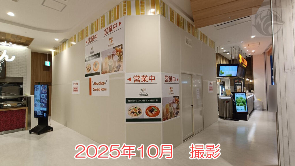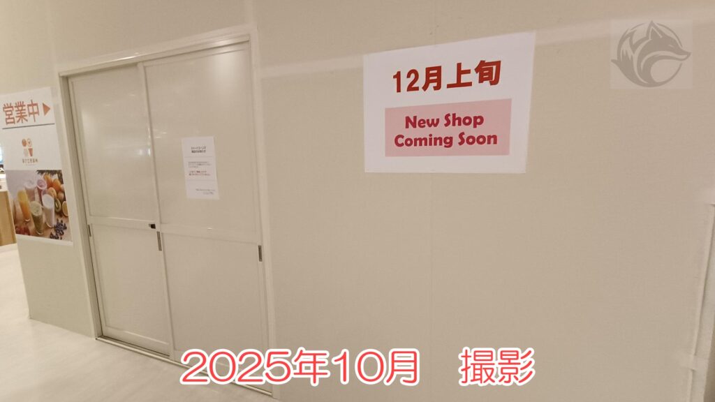 でね、2025年10月30日現在、フードコートの1区画が空いており、「12月上旬 New Shop Coming Soon」ってなってるの。