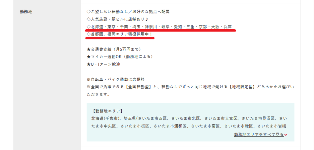 現在店舗がある北海道・東京・千葉・埼玉・神奈川・岐阜・愛知・三重・京都・大阪・兵庫・福岡の地域で募集があっただけでした。