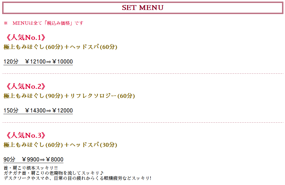セットメニューの人気No.1「極上もみほぐし(60分)+ヘッドスパ(60分)」、これいいね!