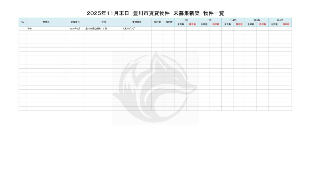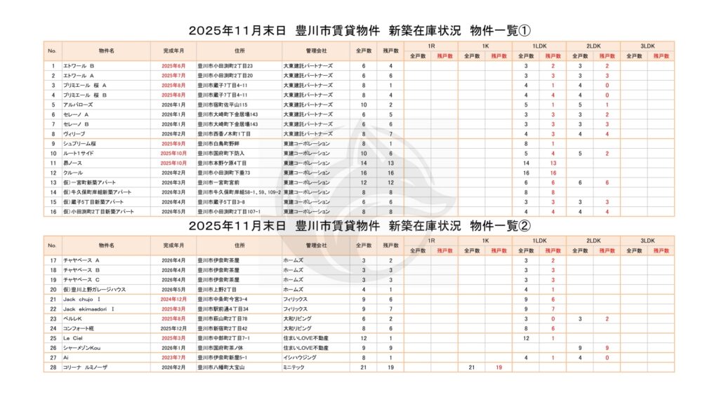 2025年11月末日 豊川市賃貸物件 新築在庫状況 物件一覧