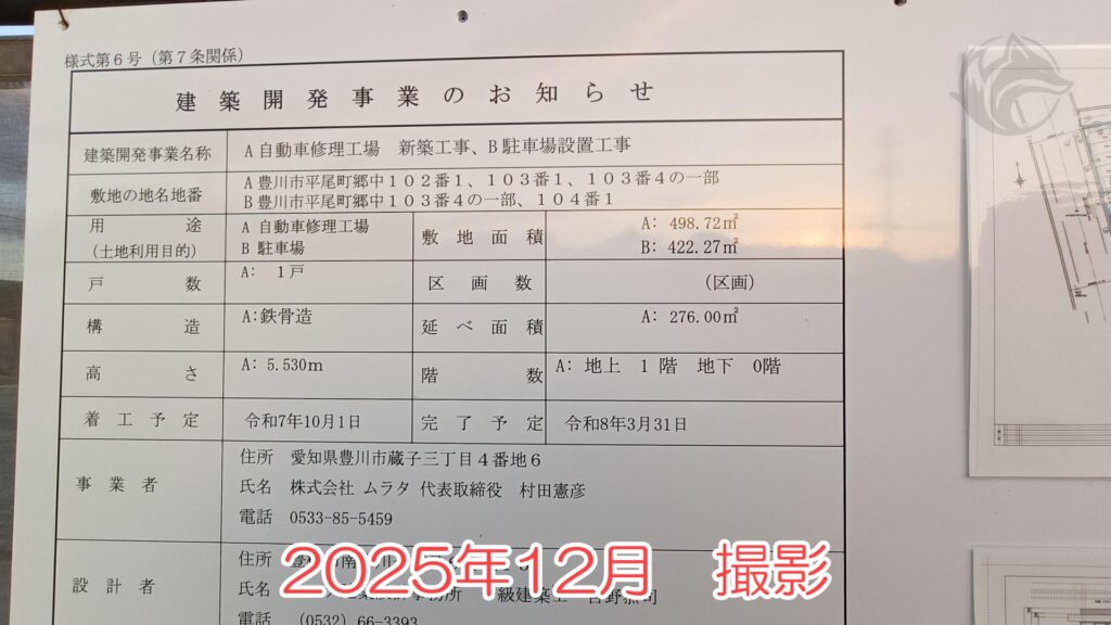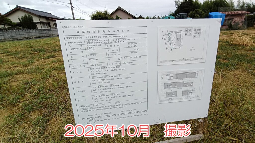 建築看板によると、場所は「豊川市平尾町郷中102-1、103-1、103-4の一部」です。