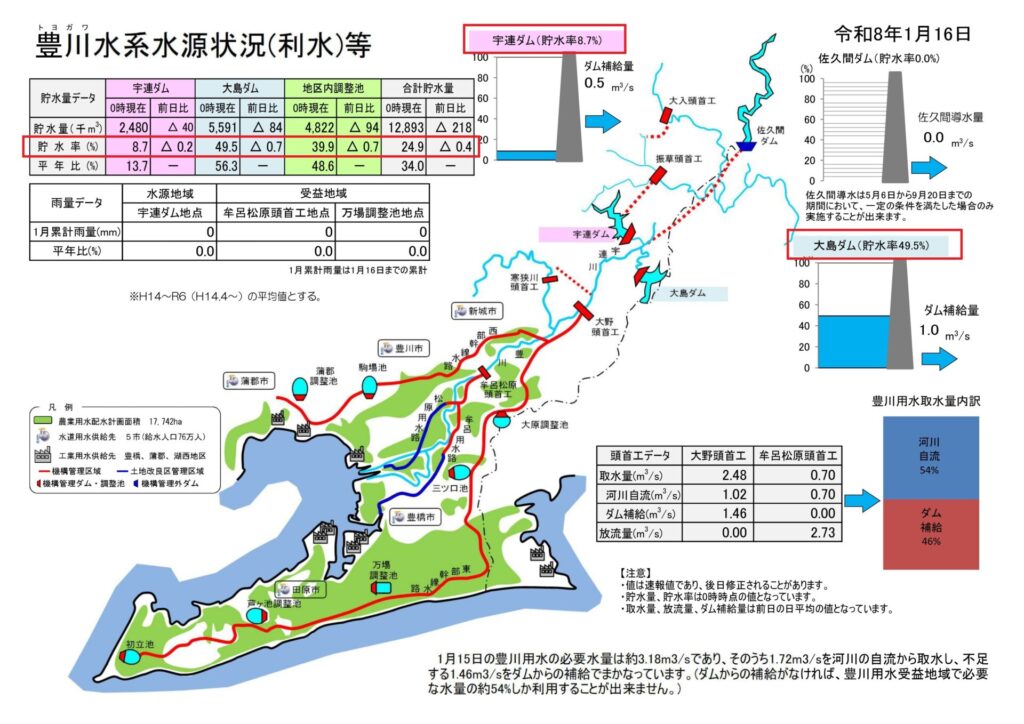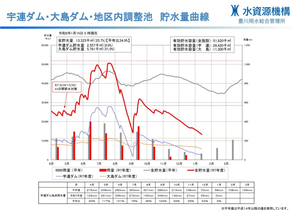 要は”水のプロ集団”なんですが、そこの情報によると、2026年1月16日時点の宇連ダム貯水率はなんと…
