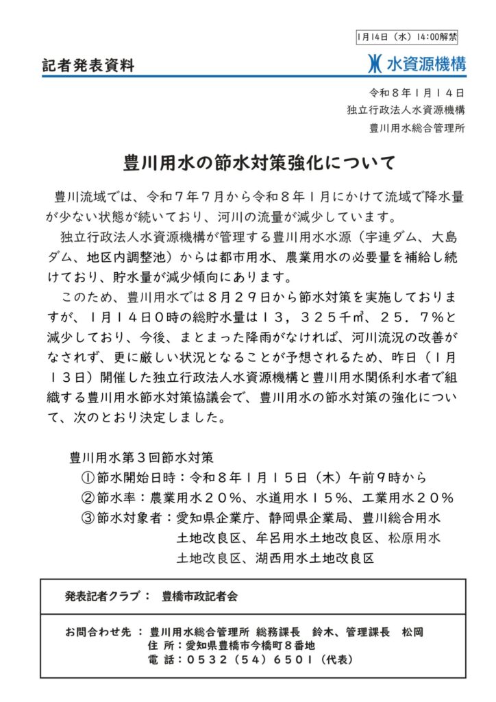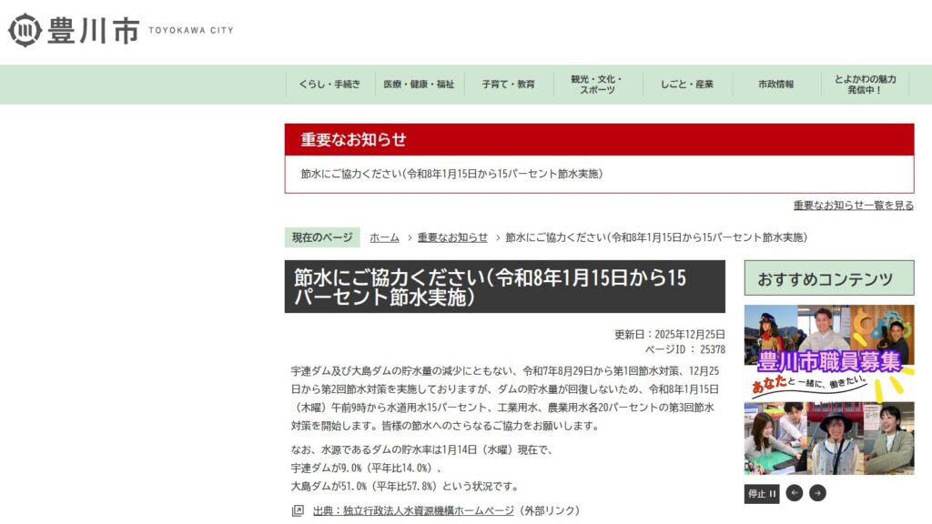 実は今に始まったことではなくて、2025年8月29日から第1回節水対策、12月25日から第2回節水対策を実施していたけど、ダムの貯水量が回復しないので第3回目を実施している状態。
