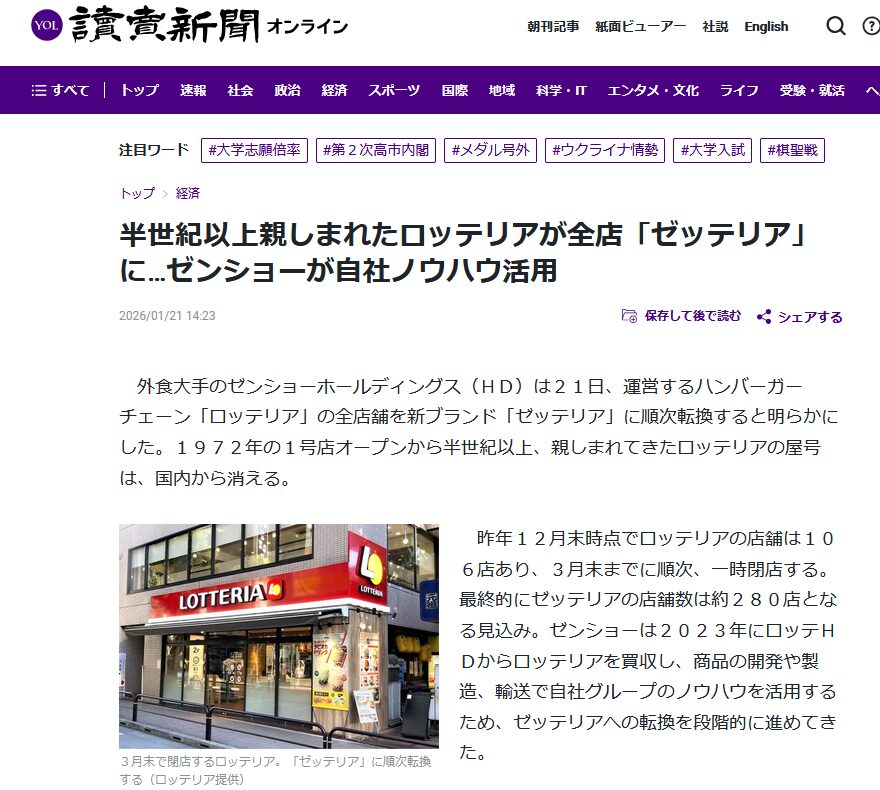 2026年3月末までに、「ロッテリア」の全店舗を新ブランド「ゼッテリア」に順次転換するとのこと。
