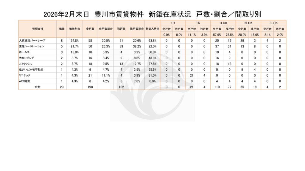 2026年2月末日 豊川市賃貸物件 新築在庫状況 戸数・割合/間取り別