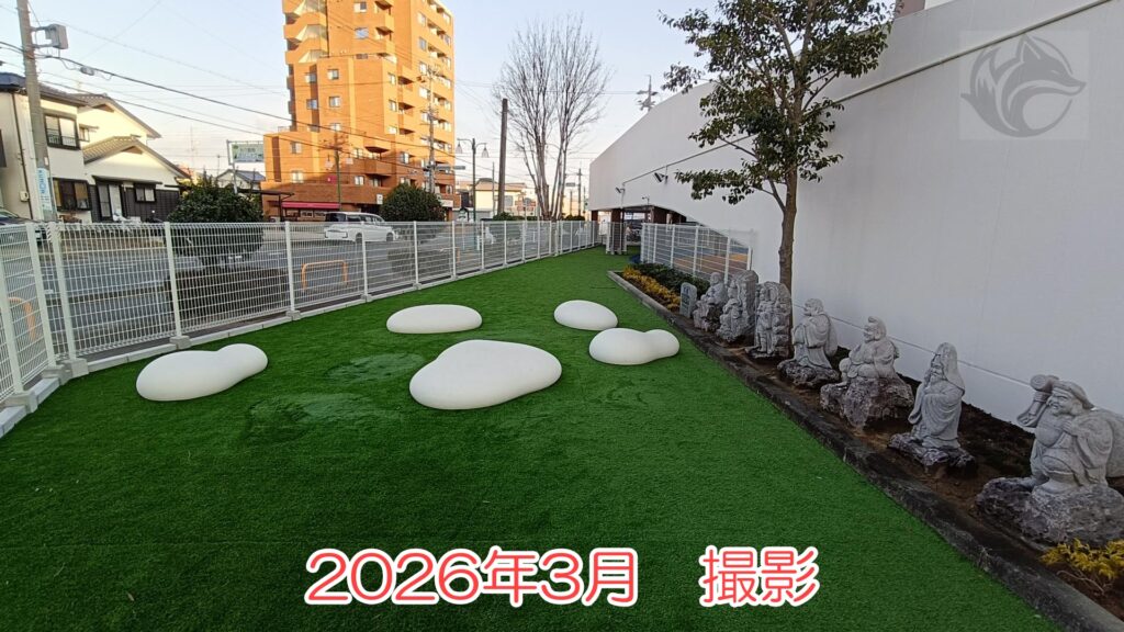 立体駐車場へ入るためのスロープがあり、その脇に七福神たちが鎮座しております。